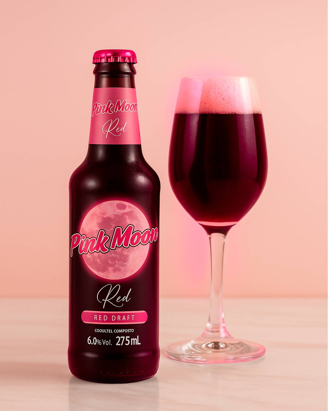 A balanced combination of the creaminess of draft beer and the elegance of wine flavor, Pink Moon is the perfect companion for every moment. Its smooth 6% alcohol content and four different formats — 250 ml glass bottle, 300 ml PET bottle, 600 ml PET bottle, and 2L growler — make it versatile enough to suit any occasion.